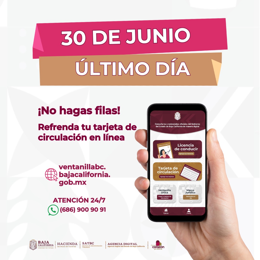 El Servicio de Administración Tributaria de Baja California (SAT BC), recuerda que el lunes 30 de junio vence el plazo para realizar el refrendo de la tarjeta de circulación, para las personas que cuentan con un vehículo modelo 2015 y años anteriores.