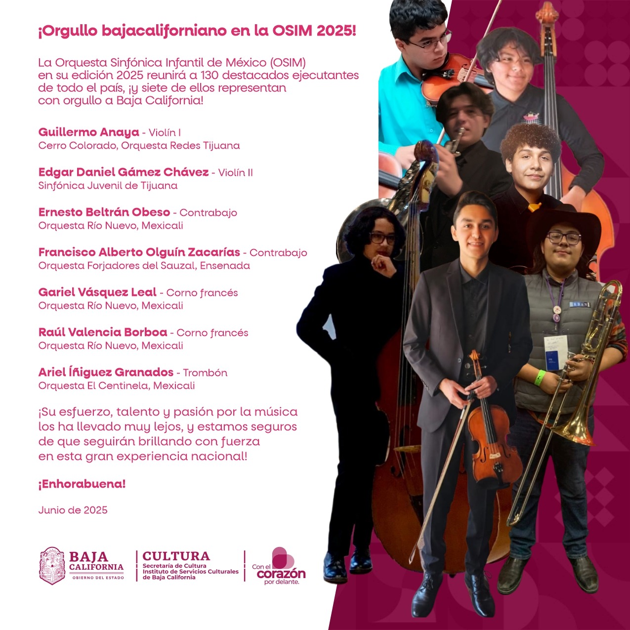 Siete jóvenes músicos de Baja California han sido seleccionados para formar parte de la Orquesta Sinfónica Infantil de México (OSIM) en su edición 2025, como parte del 33° Campamento de estudio y la Gira Nacional de Conciertos que organiza esta destacada agrupación artística.