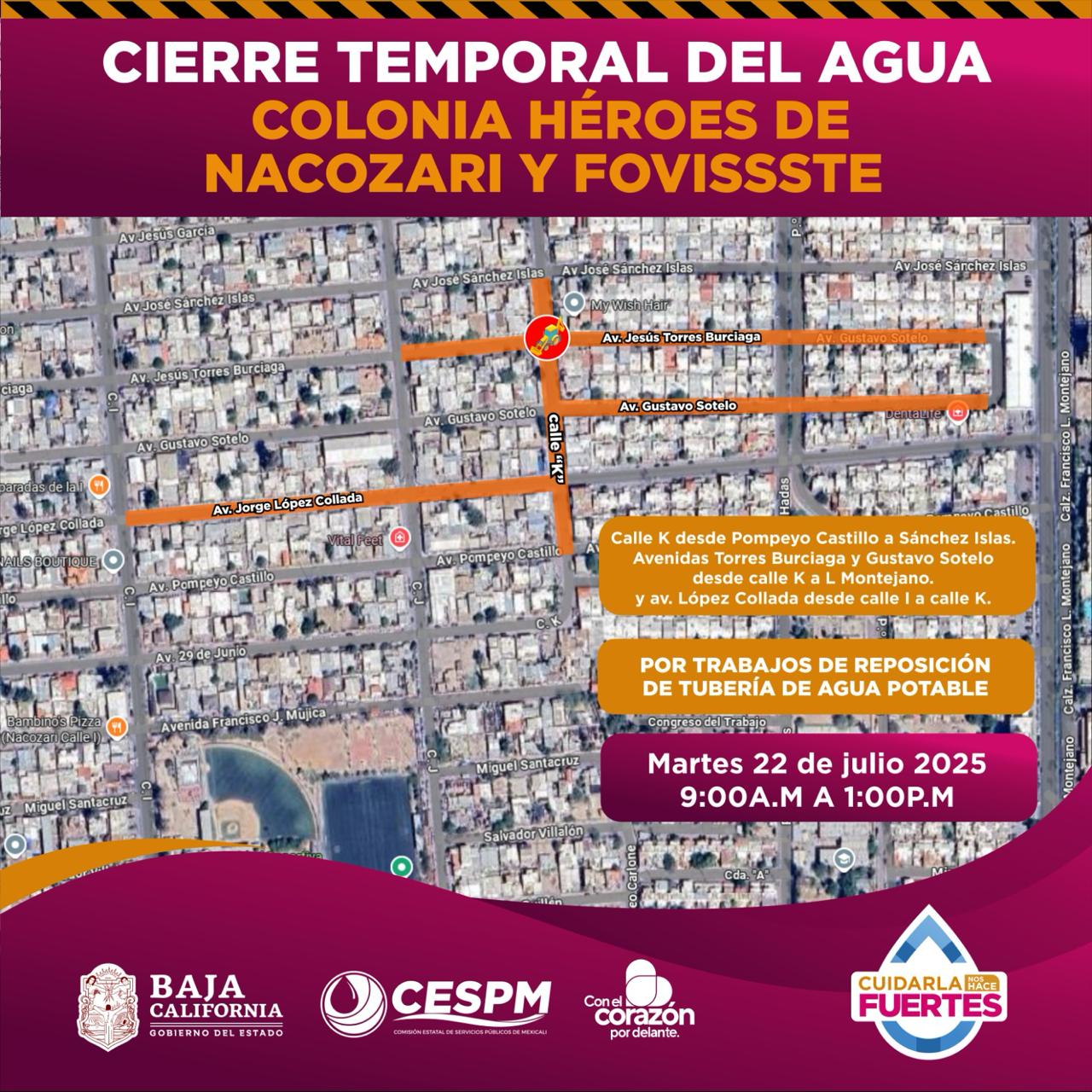 Asimismo, en las colonias Héroes de Nacozari y FOVISSSTE, se realizará la reposición de tubería sobre la calle K, desde Pompeyo Castillo hasta Sánchez Islas; así como en las avenidas Torres Burciaga, Gustavo Sotelo y López Collada, en el tramo comprendido entre calles I y L Montejano. Estos trabajos se ejecutarán en el mismo horario, de 9:00 a.m. a 1:00 p.m.