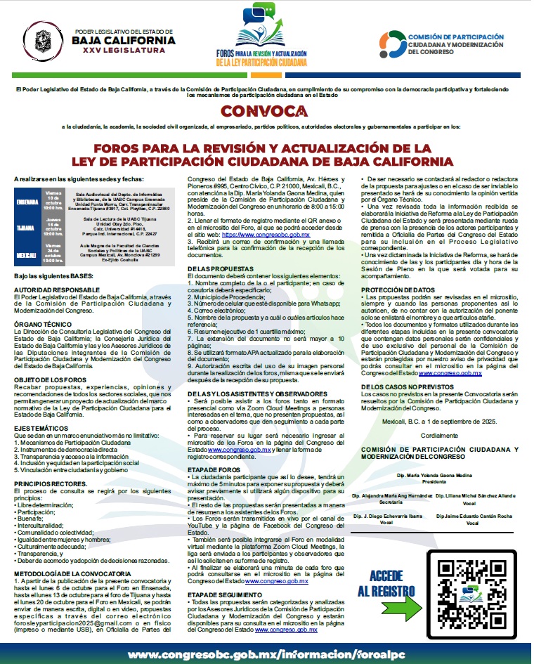 El Poder Legislativo de Baja California a través de la Comisión de Participación Ciudadana, en cumplimiento de su compromiso con la democracia participativa y fortaleciendo los mecanismos de participación ciudadana, lanzó la convocatoria para las y los interesados en asistir a los Foros para la Revisión y Actualización de la Ley en la materia.