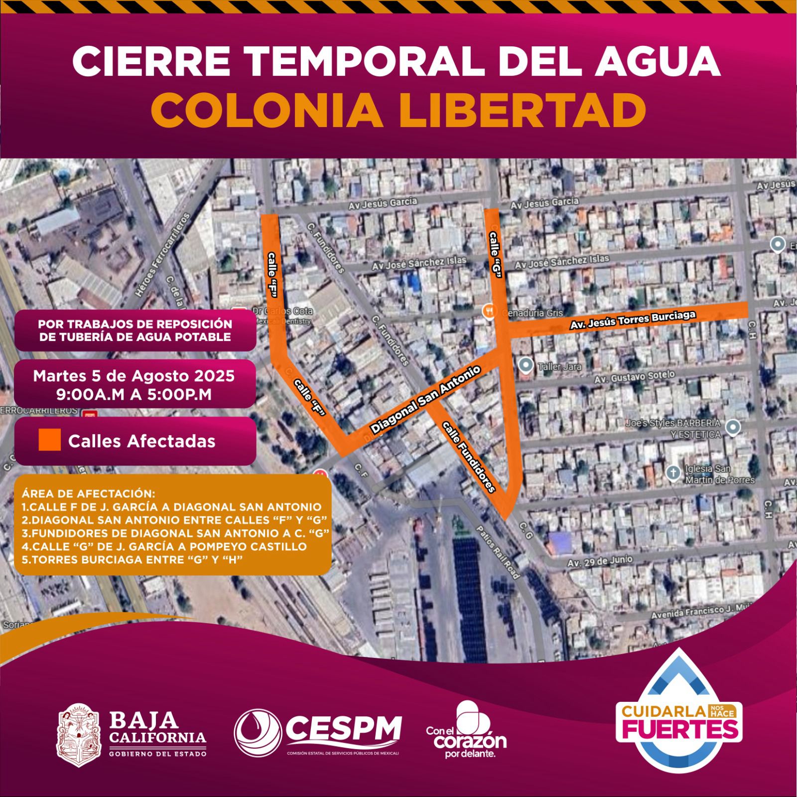 La Comisión Estatal de Servicios Públicos de Mexicali (CESPM) informa a los residentes de la colonia Libertad sobre la suspensión temporal del servicio de agua potable, programada para este martes 5 de agosto de 2025, en un horario de 9:00 de la mañana a 5:00 de la tarde.