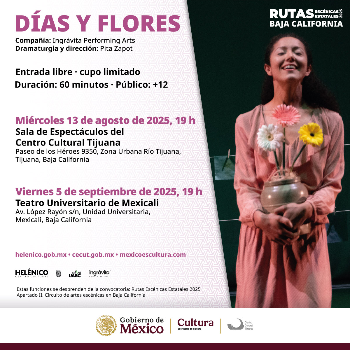 En Mexicali, la compañía Ingrávita Performing Arts presentará la obra Días y flores el viernes 5 de septiembre a las 19:00 horas en el Teatro Universitario de la UABC. Esta puesta en escena está dedicada a las personas y familias que enfrentan la desaparición forzada de un ser querido, y surge como un acto de memoria y transformación, en el que el dolor se transmuta en un gesto de amor a través del arte teatral. La función está recomendada para mayores de 13 años.