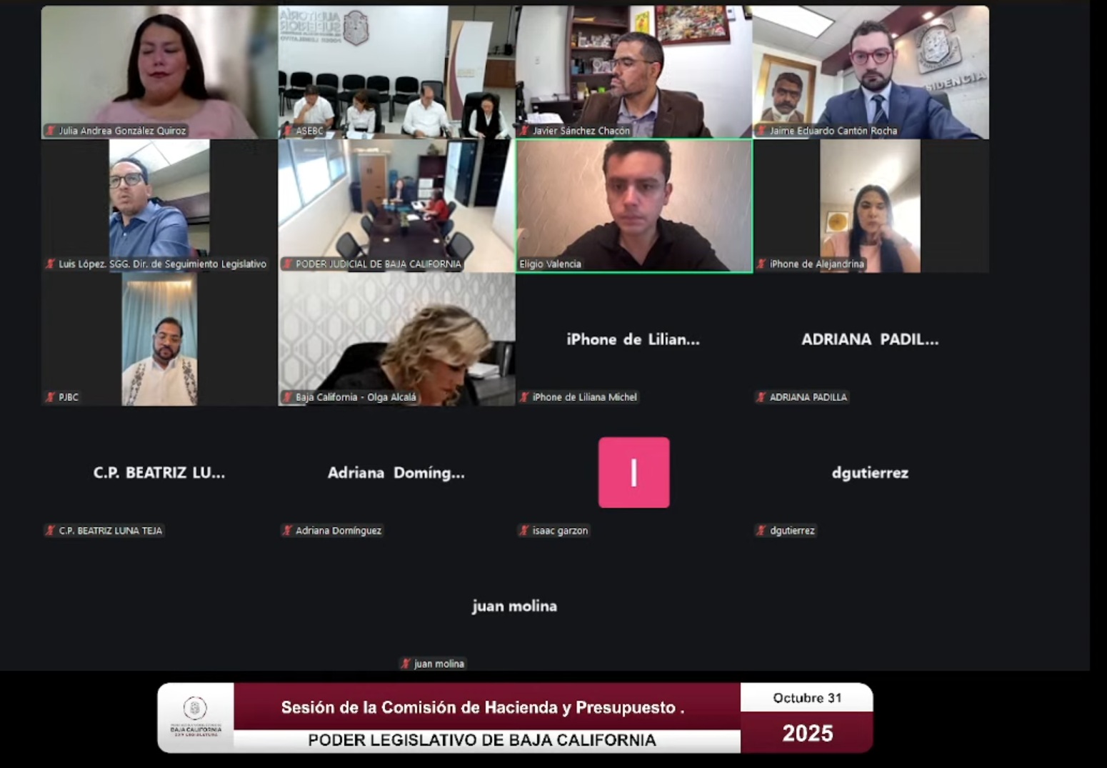 En esta sesión de la Comisión dictaminadora presidida por la Diputada Julia González, participaron de manera virtual, las diputaciones siguientes: Eligio Valencia, Michel Sánchez, Juan Manuel Molina, Jaime Cantón, Adriana Padilla, y Alejandrina Corral, así como el Auditor Superior del Estado en funciones, Arnulfo Zárate.