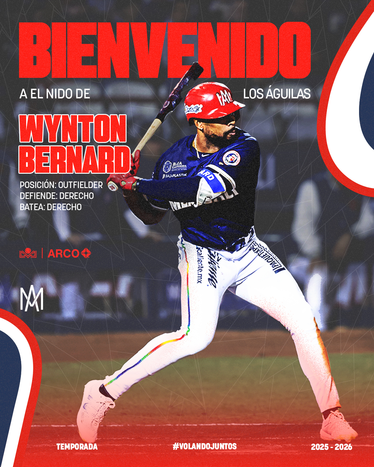 El jardinero Wynton Bernard está de regreso con el Club Águilas de Mexicali, con el objetivo de reforzar el roster Emplumado para el resto de la temporada 2025-2026 de la Liga ARCO Mexicana del Pacífico, presentada por Caliente.mx