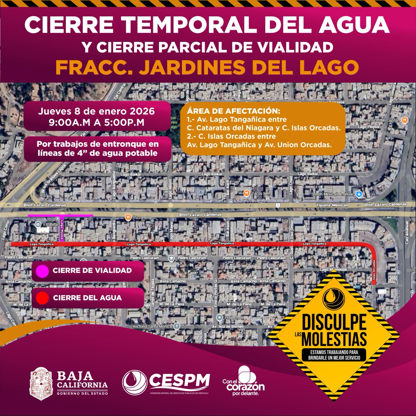 La Comisión Estatal de Servicios Públicos de Mexicali (CESPM) informó que el jueves 8 de enero de 2026 se llevará a cabo un cierre temporal del suministro de agua potable, así como un cierre parcial de vialidades en el fraccionamiento Jardines del Lago, debido a trabajos de entronque en líneas de distribución.