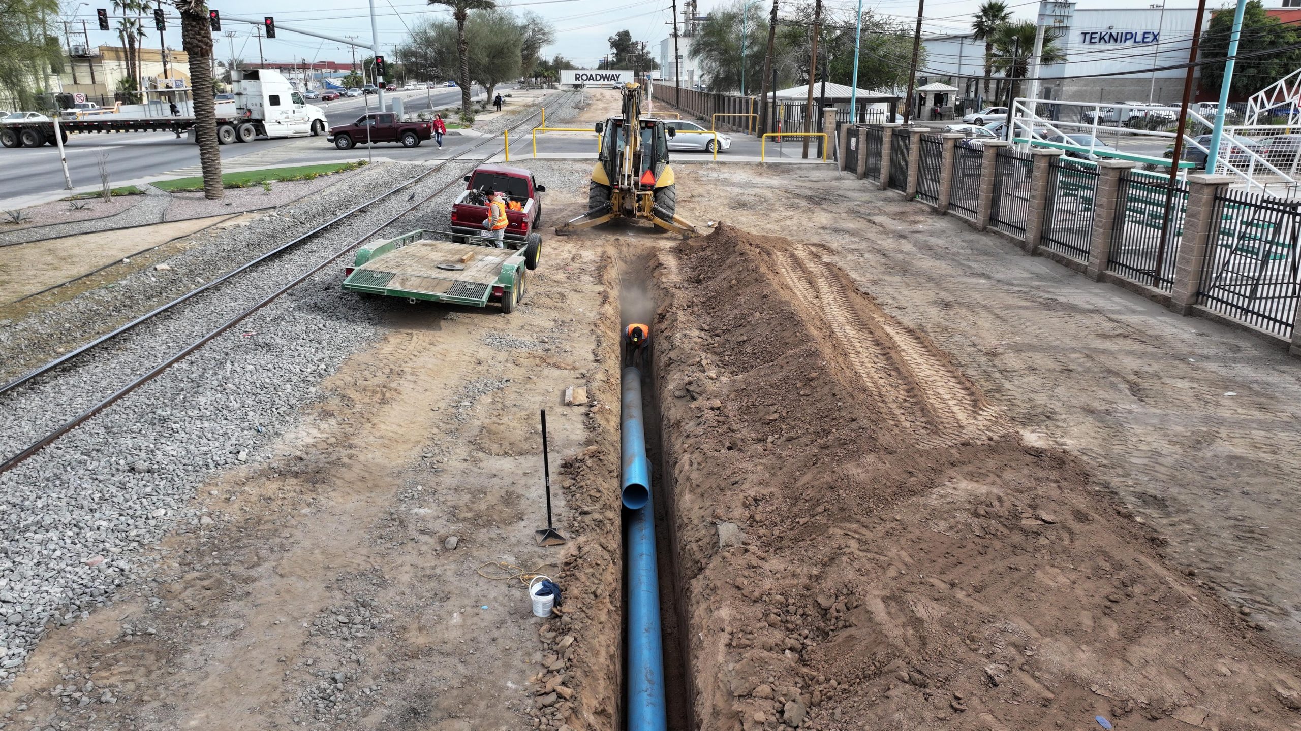La Comisión Estatal de Servicios Públicos de Mexicali (CESPM) lleva a cabo la reposición de la línea de agua potable de asbesto-cemento por tubería de PVC hidráulica de 12 pulgadas de diámetro, sobre la carretera a San Luis Río Colorado, en el tramo comprendido desde la avenida Topacio hasta la calle San Francisco.