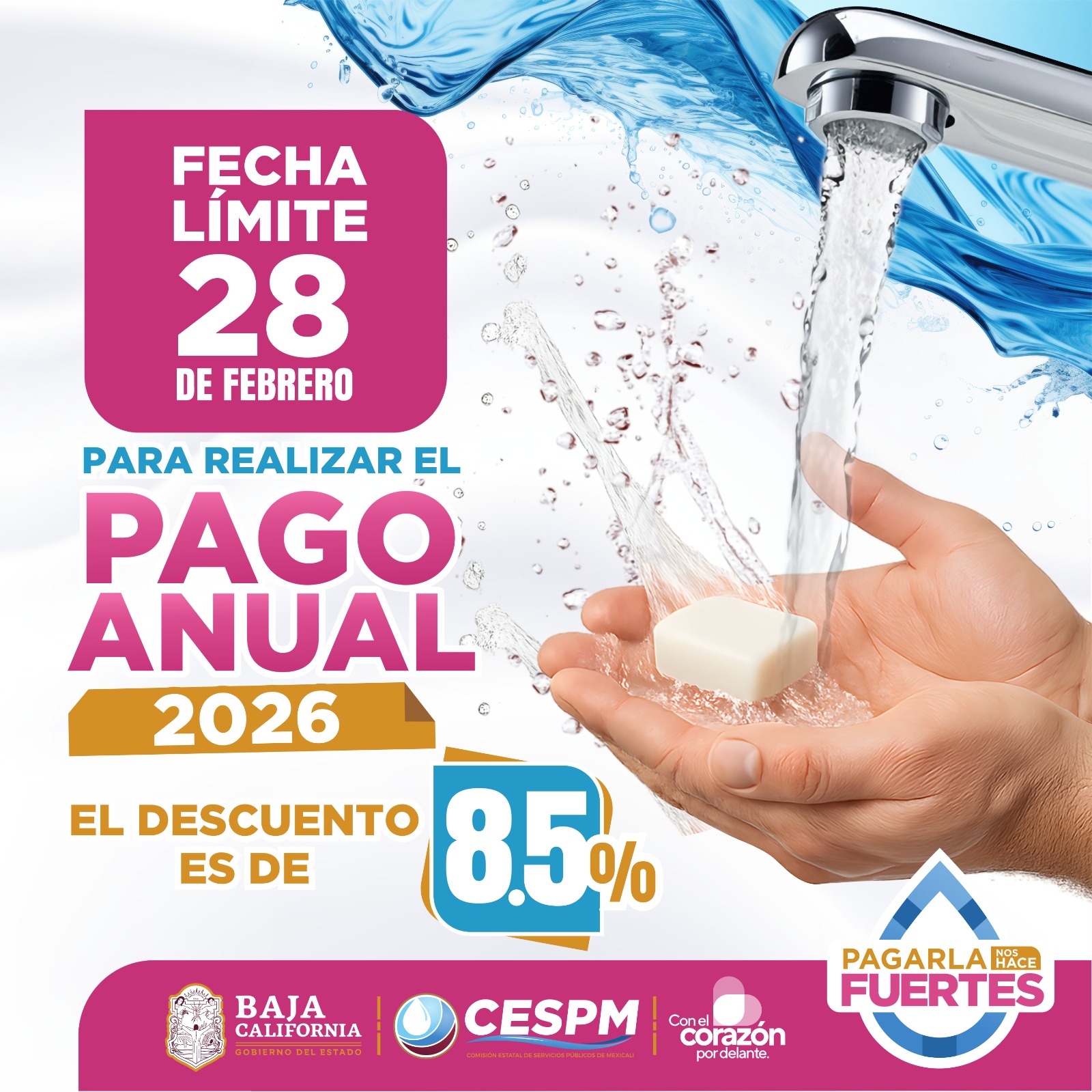 La Comisión Estatal de Servicios Públicos de Mexicali (CESPM) informó que este sábado 28 de febrero concluye el plazo para acceder al descuento del 8.5 por ciento en el pago anual anticipado del servicio medido de agua potable, conforme a lo establecido en la Ley de Ingresos del ejercicio fiscal 2026.