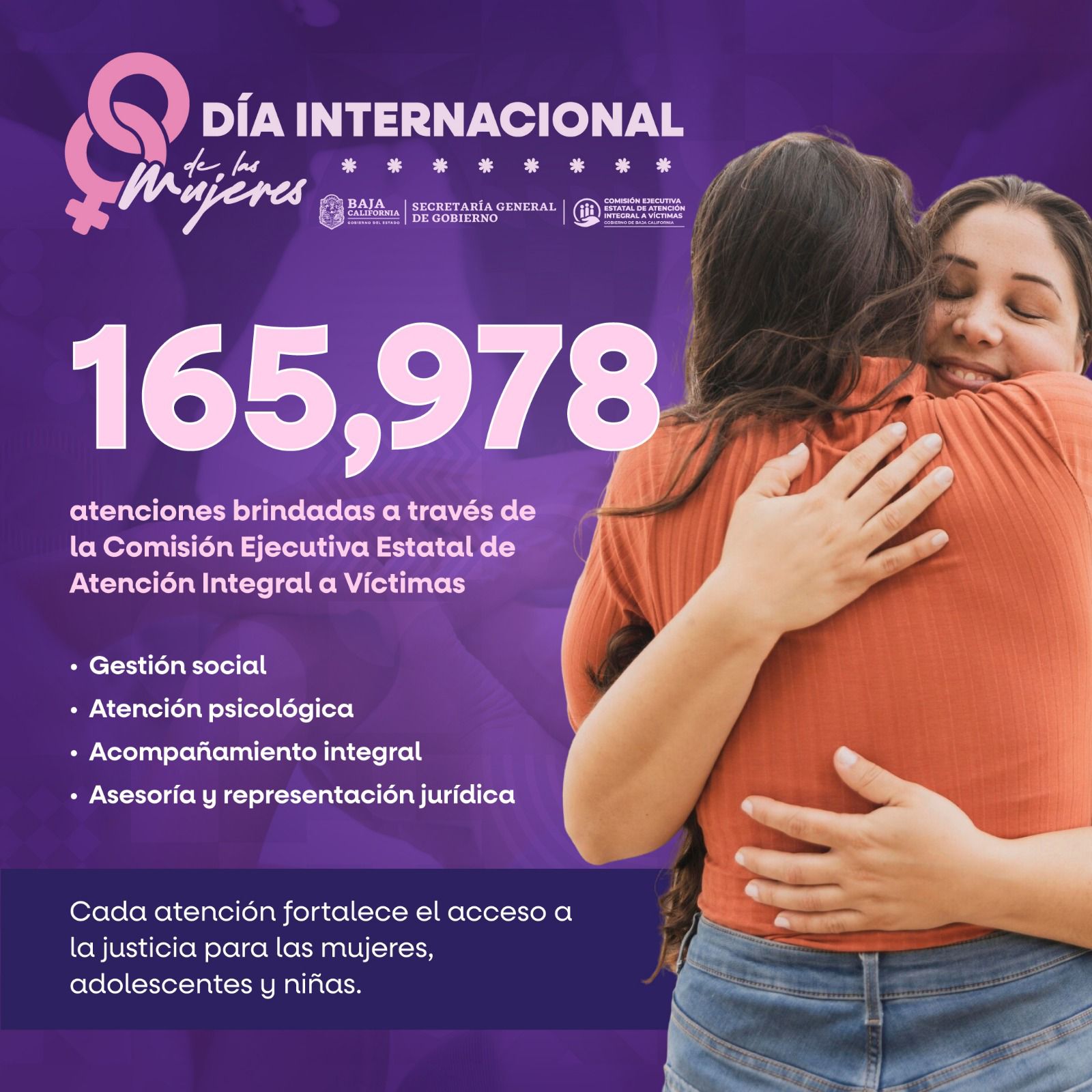 En el marco del Día Internacional de las Mujeres, la Secretaría General de Gobierno informó que, a través de la Comisión Ejecutiva Estatal de Atención Integral a Víctimas (CEEAV), durante la presente administración se han brindado 165,978 mil servicios integrales a niñas, adolescentes y mujeres en Baja California.